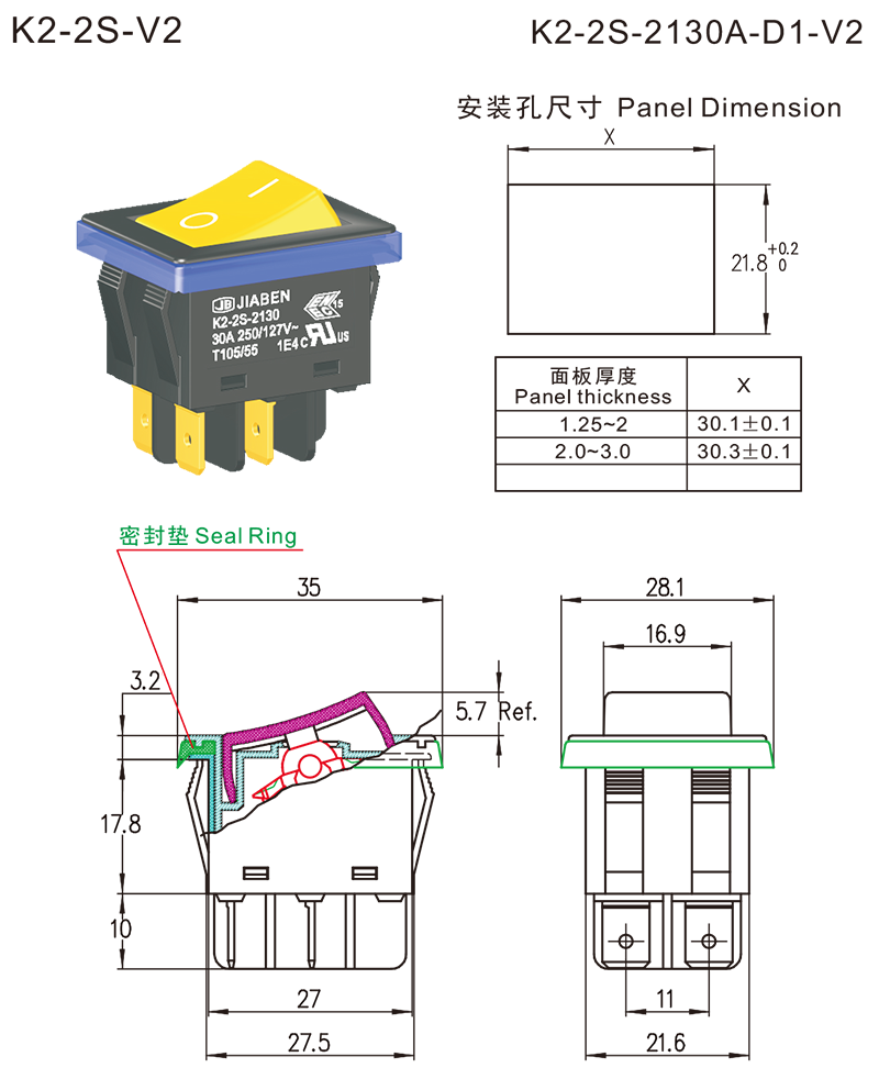K2-2S series (Dustproof and Waterproof) High Rated Rocker Switches