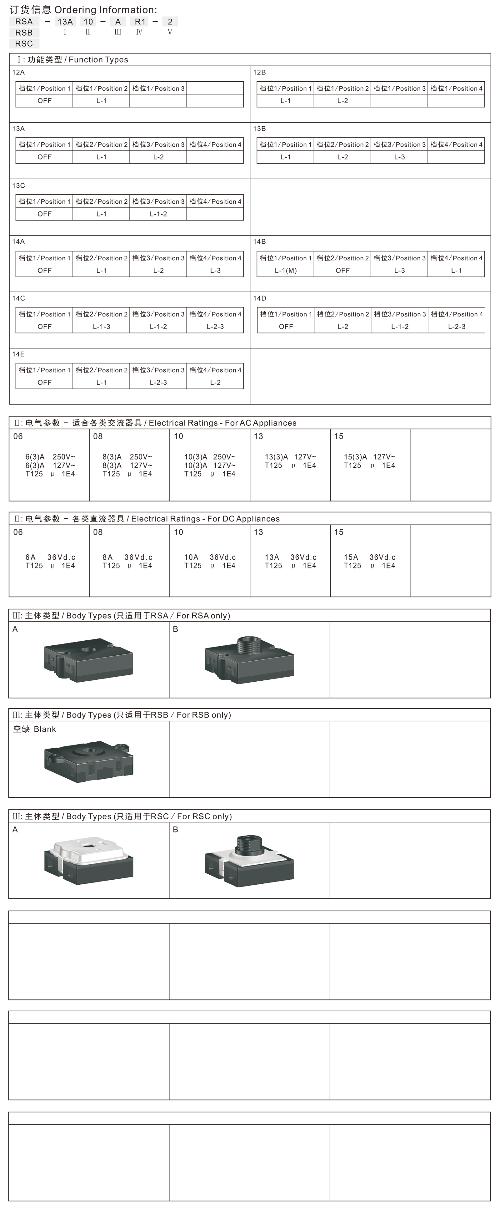 ◆RSA, RSB, RSC series are general type rotary switches, for popular used in home appliances such as: Slower Cookers, Food Mixers, Full Automatic Soya-bean Milk Machines, Juicers, Vacuum Cleaner, Electric Fan, Air Condition Fan, Table Lamps, etc. Also for used in some special Power-tools and Gardening tools, such as: Heat Guns, Electric Blowers, etc.