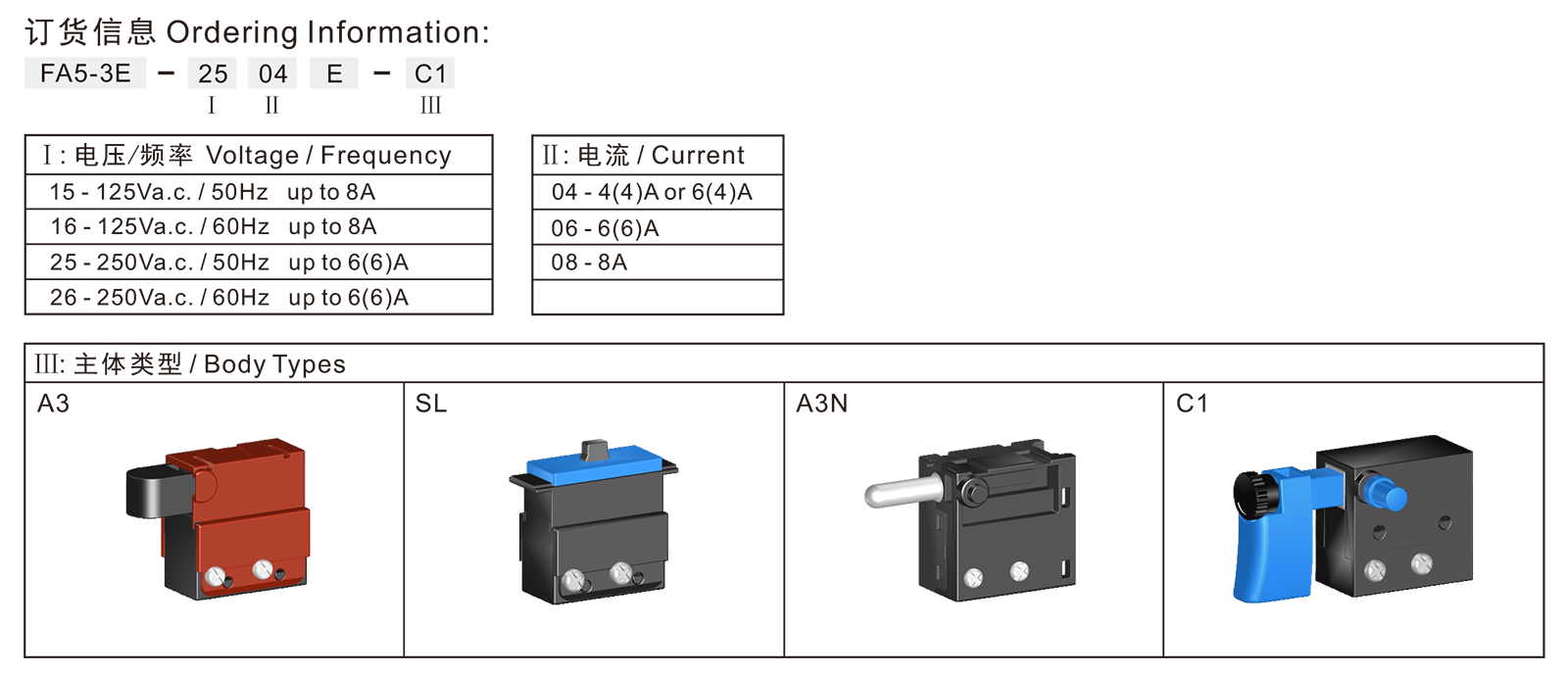 ◆FA5-3E series are one general type variable speed trigger switches with by-pass contact, for popular used in portable power-tools such as: Electric Drills, Rotary Hammers, Jig Saws, Foot Variable Speed Switches, etc.