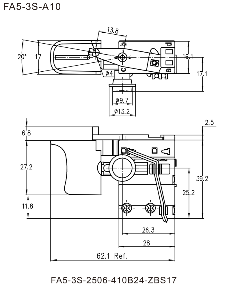 ◆FA5-3S/FA5-6S 系列是一款通用型扳機電子調速開關,其中FA5-6S系列是升級款,可以承受更大的電流沖擊,集成防塵功能,廣泛應用于各類電動工具,如: 6mm電鉆、10mm電鉆、沖擊鉆、沖擊螺絲起子、電錘、曲線鋸、攪拌器、平板砂光機等, 也可用于吊磨機的腳踏開關等。開關有多種扳機、鎖鈕和撥桿可以選擇,也可以根據客戶要求進行定制。