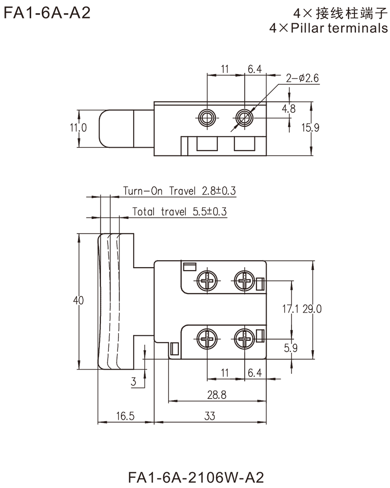 →2×接線柱端子 Pillar terminals φ=2.6mm or 2.8mm