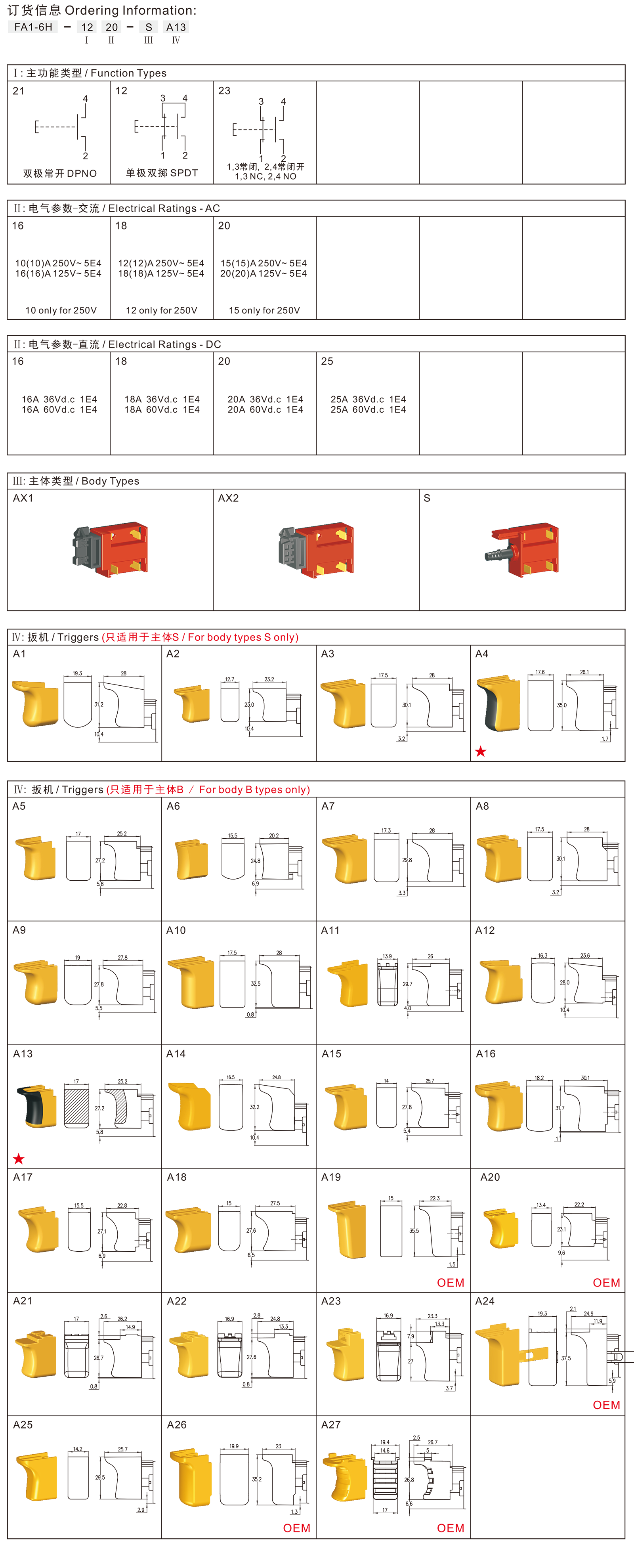 ◆FA1-6H series are general type high rated trigger switch, have integrated dustproof version, special for used in DC power-tools and gardening tools such as DC Circular Saws, DC Electric Chain Saws, DC Electric Lawnmowers, DC Electric Snowthrowers, etc.