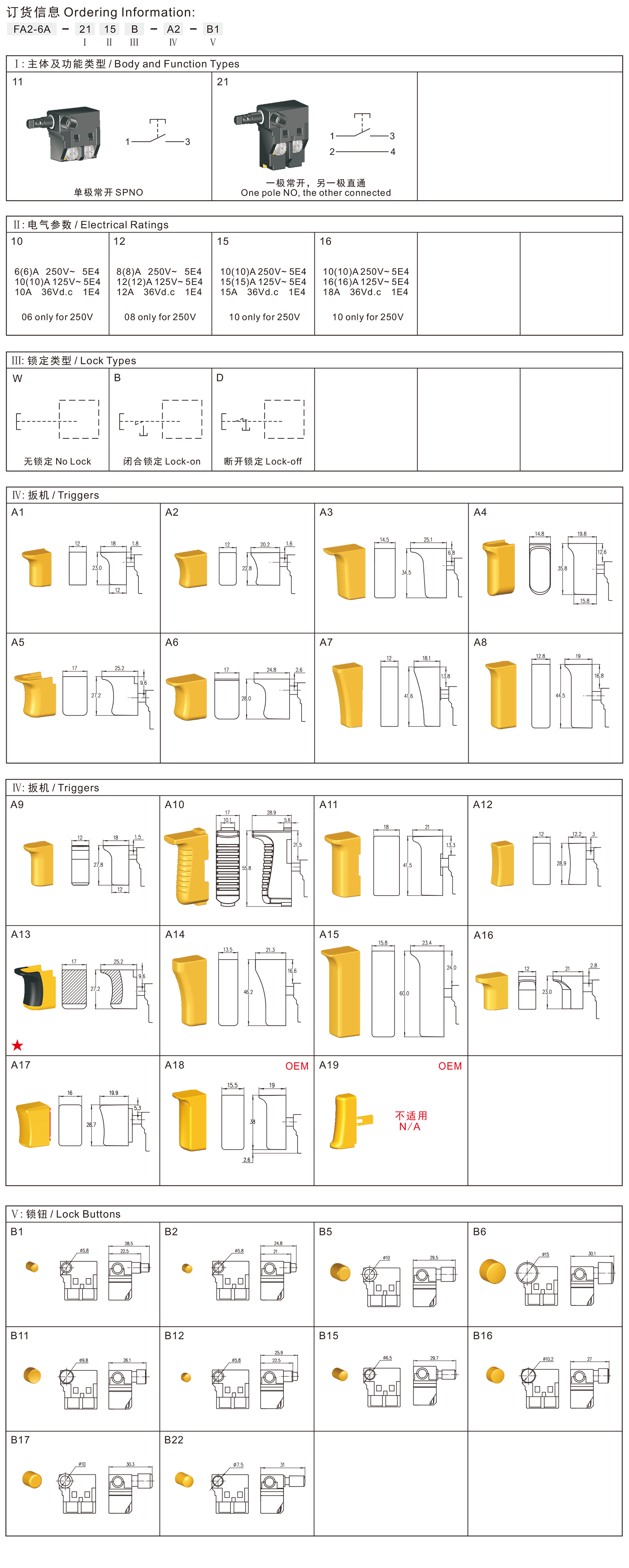 FA2-6A series are one general type trigger switch, integrated dustproof, commonly for used in portable power tools such as Electric Drills, Marble Cutters, Circular Saws, Electric Routers, Belt Sanders, Electric Planers, etc.