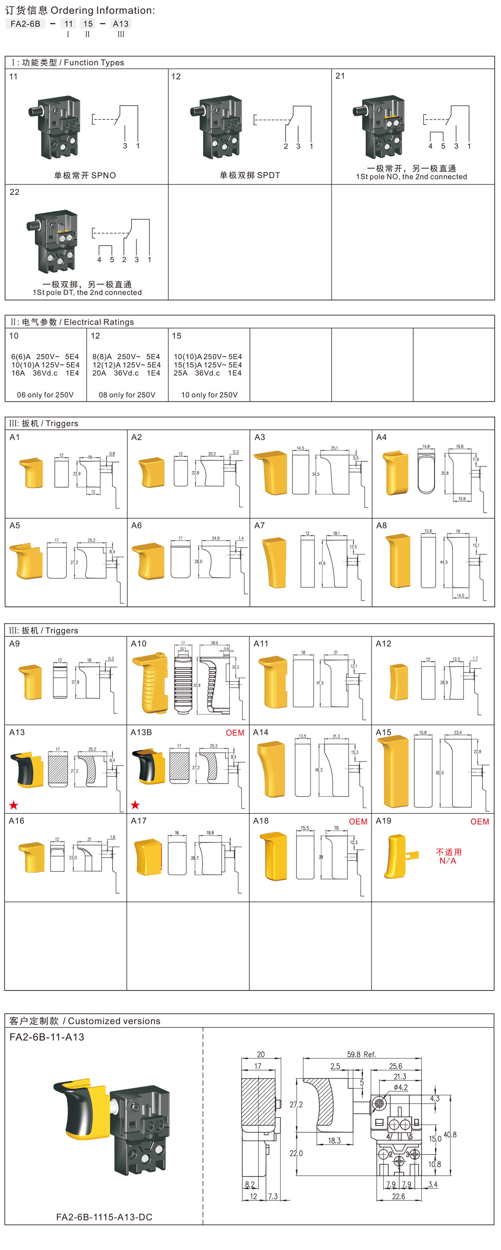 FA2-6B系列是一款通用型的扳機開關,集成防塵功能,廣泛應用于各類電動工具,如:型材切割機、斜切鋸、電圓鋸、電錘等。