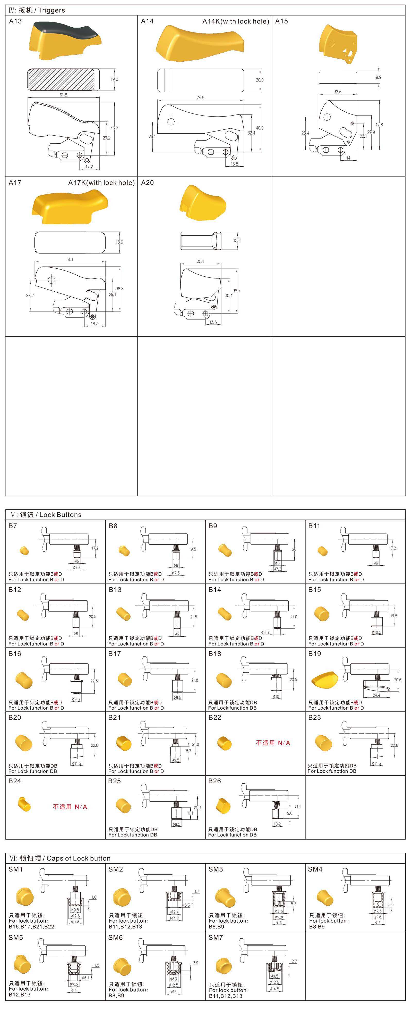 ◆FA1-10A series are general type high rated trigger switches,integrated dustproof, with snap-action structure, for used in high rated bench top or portable power-tools such as Cut-off Machines,Miter Saws, 150mm, 180mm and 230mm Large Angle Grinders, Polishers, Circular Saws, Rotary Hammers, Demolition Hammers, Electrics Chain Saws, etc.
