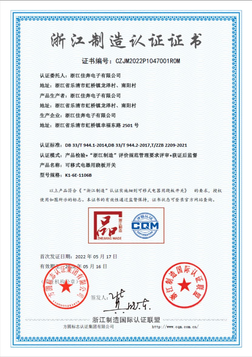 K1-6E系列蹺板開關(guān)產(chǎn)品榮獲“浙江制造品字標(biāo)認(rèn)證證書”!
